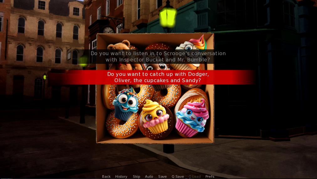 Now a sidebar. One of the opportunities, in the visual novel space, is to have multiple branches and even, multiple endings based on decisions readers make. I had written some traps, but reasoned it would be unfair to have a family interacting with the story, and each other, to have the possibility of a "wrong" choice. So I provide options, and then the ability to see what happens with a different choice and still stay on track.